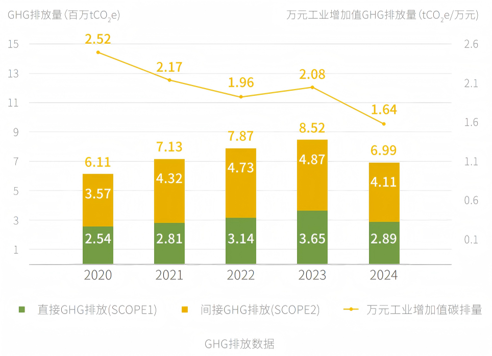 碳排放管理方面,公司承诺“2029年碳达峰、2050年碳中和”的目标。2024年范围1+2温室气体排放量为699万tCO₂e,同比下降17.96%,首次实现年度下降;万元工业增加值GHG排放量下降至1.64tCO₂e,较2020年基准值下降34.9%,提前达成2025年度气候变化目标。然而,范围3排放披露仍不完整,仅涵盖5项、总计441.84吨CO₂e,显示公司在上下游减碳协同和供应链碳核算方面仍有提升空间。