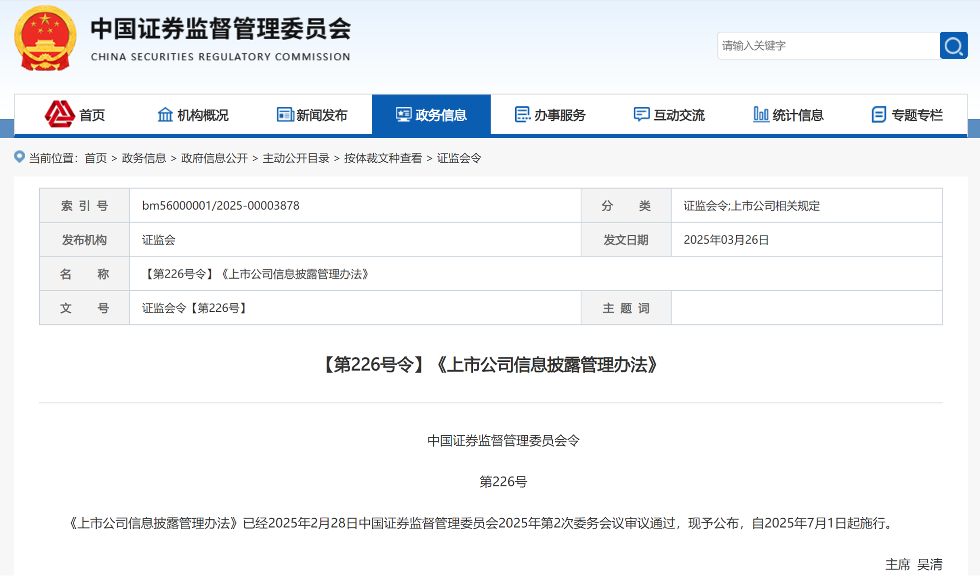 近日,中國證券監督管理委員會發布修訂後的《上市公司信息披露管理辦法》(以下簡稱《信披辦法》),定於2025年7月1日起正式施行。此次修訂旨在完善上市公司信息披露制度,優化披露內容,增強信息披露的針對性和有效性。