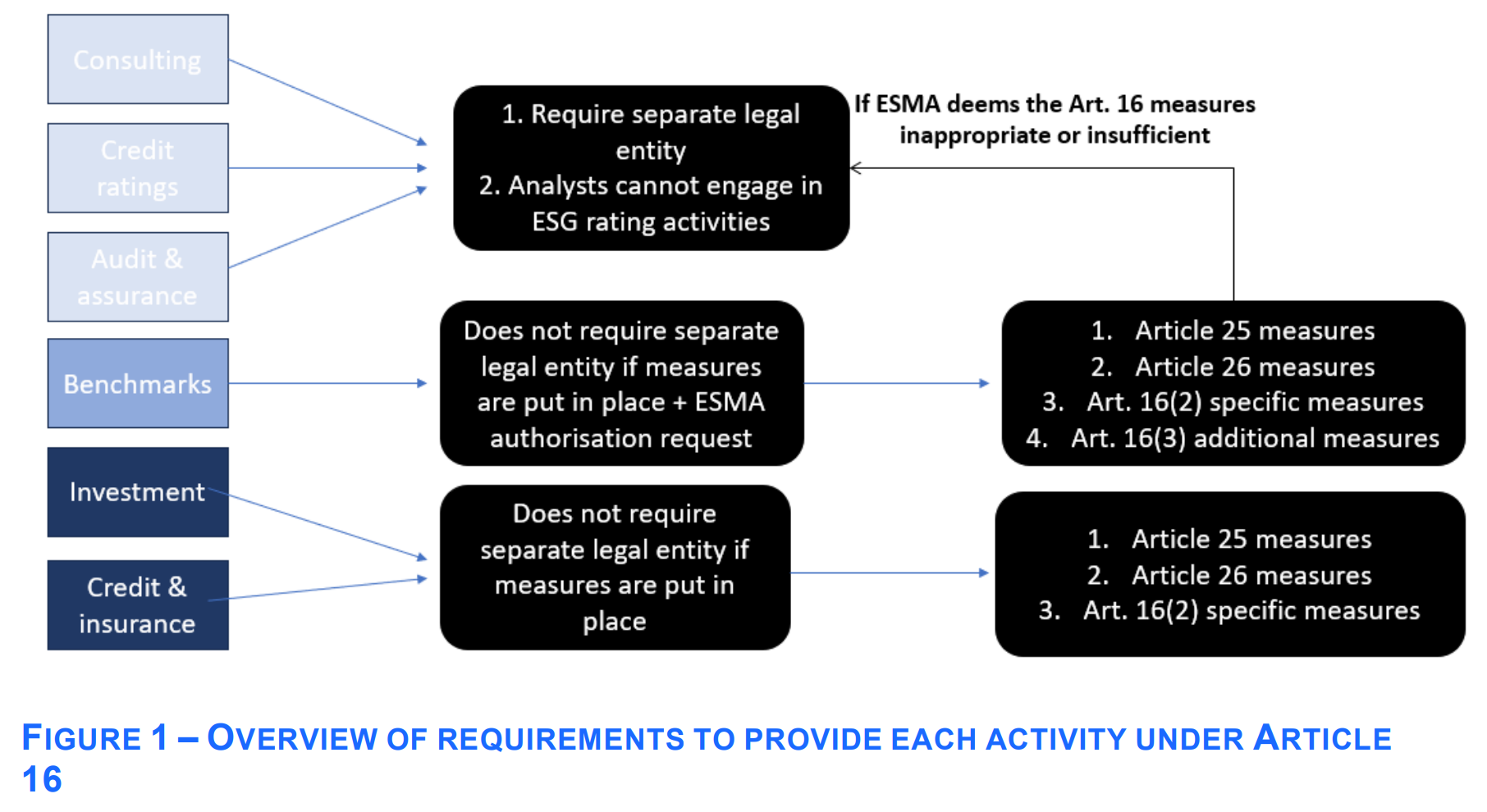 基于ESGRR第16条,ESG评级提供者在同一法人下原则上不得同时开展咨询、信用评级、审计、投资、银行保险及基准服务。若依据法条享有例外,可提供投资、保险或基准业务,但须实施冲突防范: